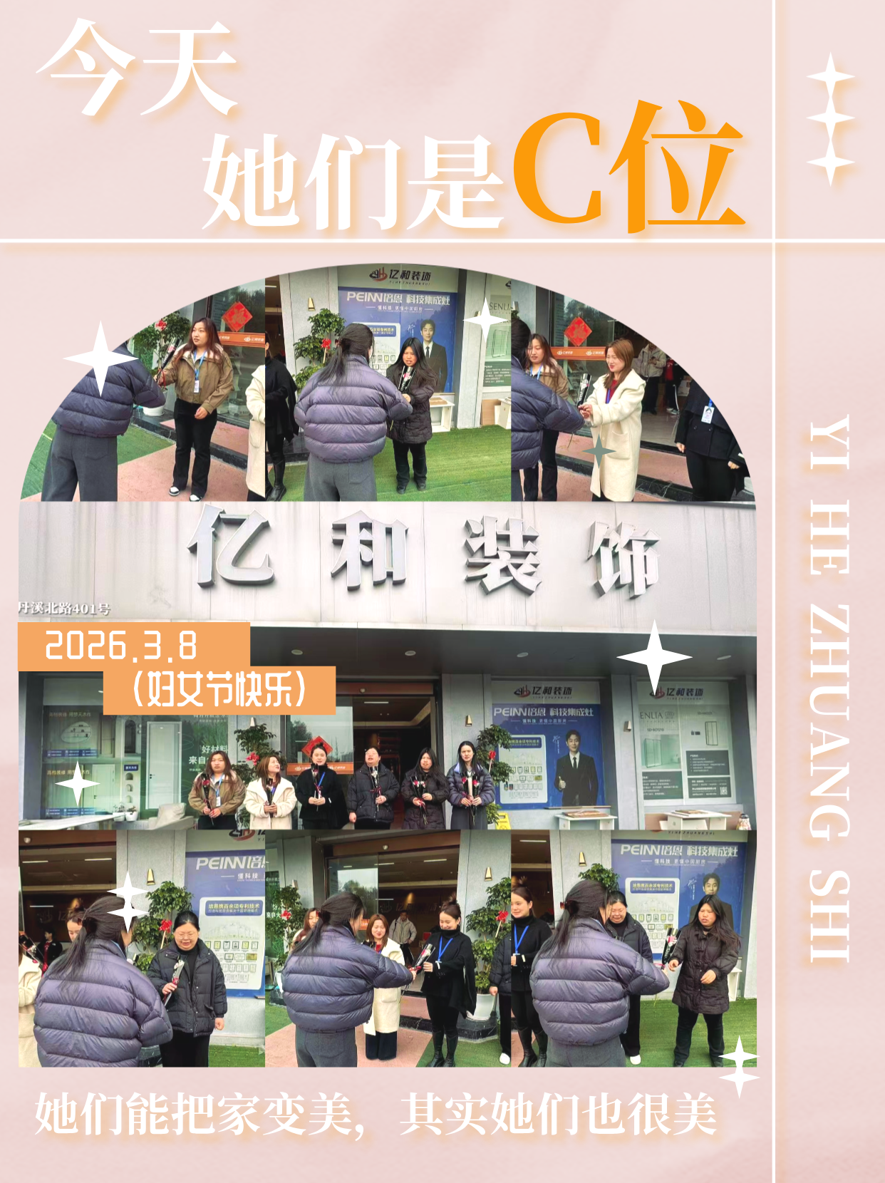 三月的风带着春意,也带来了属于她们的节日。 今天,亿和装饰三个门店同步开展了一场小小的节日仪式——为每一位女员工送上一朵玫瑰花。没有盛大的排场,只有一份朴素的心意:感谢她们在日常工作中的付出,也提醒她们,在装点无数个家的同时,别忘了自己也很美。 在亿和,她们是设计师,用图纸勾勒理想;是项目经理,在工地间穿梭协调;是后台支撑,让每一个环节顺畅运转。她们的专业和细腻,让每一个家从毛坯变成有温度的空间。 今天,我们想借这一朵花,对她们说一声:辛苦了,节日快乐。愿你们永远自信、美丽,也愿你们继续在热爱的领域里发光。 亿和装饰,用心装点每一个家,也用心对待每一位并肩同行的人。