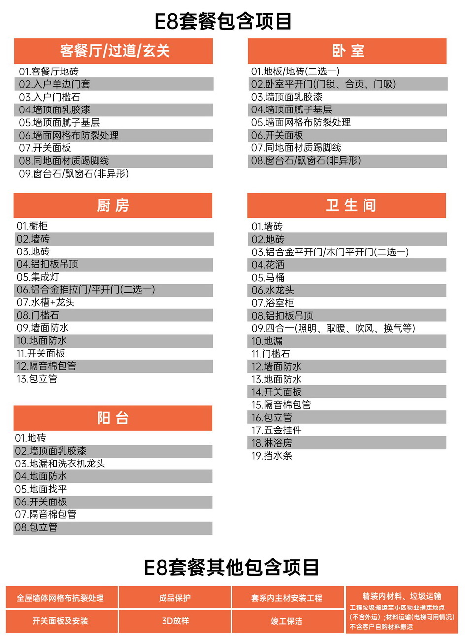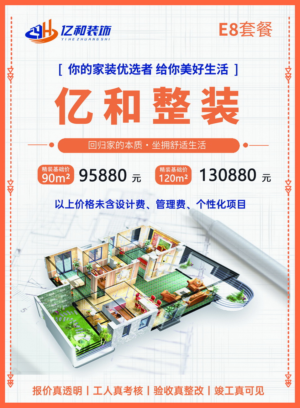 亿和装饰 E8 整装套餐全新亮相!E8 套餐升级高端品牌,90㎡95800 元起,更享 3D 放样服务。十步标准化服务流程,从选材到售后全程透明,让您省心装出理想家。