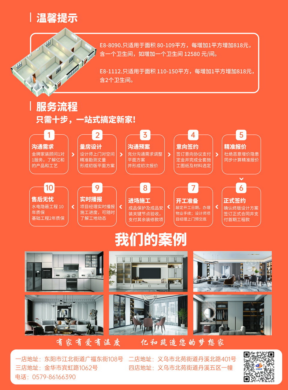 亿和装饰 E8 整装套餐全新亮相!E8 套餐升级高端品牌,90㎡95800 元起,更享 3D 放样服务。十步标准化服务流程,从选材到售后全程透明,让您省心装出理想家。